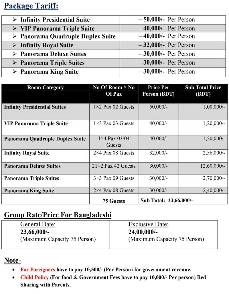 Price per person for the above itinerary shall be as follows only for Bangladeshi: